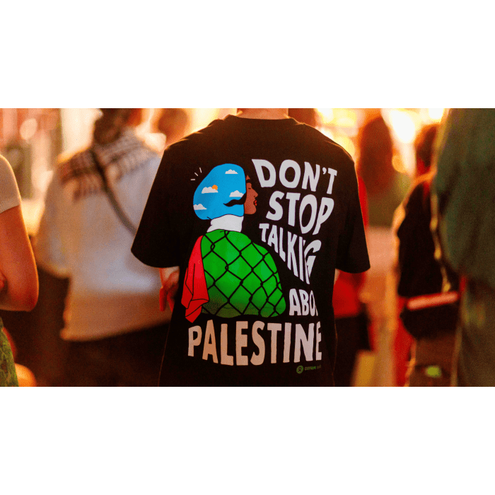 Blijven praten over Palestina is belangrijker dan ooit. Verspreid de boodschap en draag het uit met deze unieke t-shirt. Met de opbrengsten draag je bij aan onze noodhulp in Gaza en het werk dat wij doen om aandacht te blijven vragen voor Palestina.