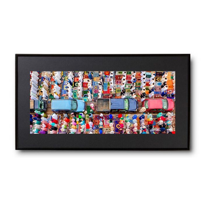 De zwarte aluminium lijst met polyglas wordt geleverd met bijpassende witte én zwarte passe-partout.